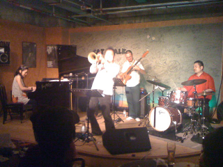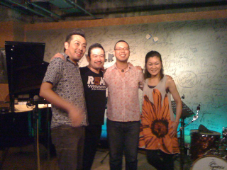 今や全国的な活躍をされている、トノちゃんこと土濃塚さんのフリューゲルホーンの音色は冴え渡り、今回のツアー初参加の女性ピアニスト清水さんのファンキーなバッキング、歌いまくるフレットレスベースの織原さん、ステディでシャープなドラミングの藤井さん。