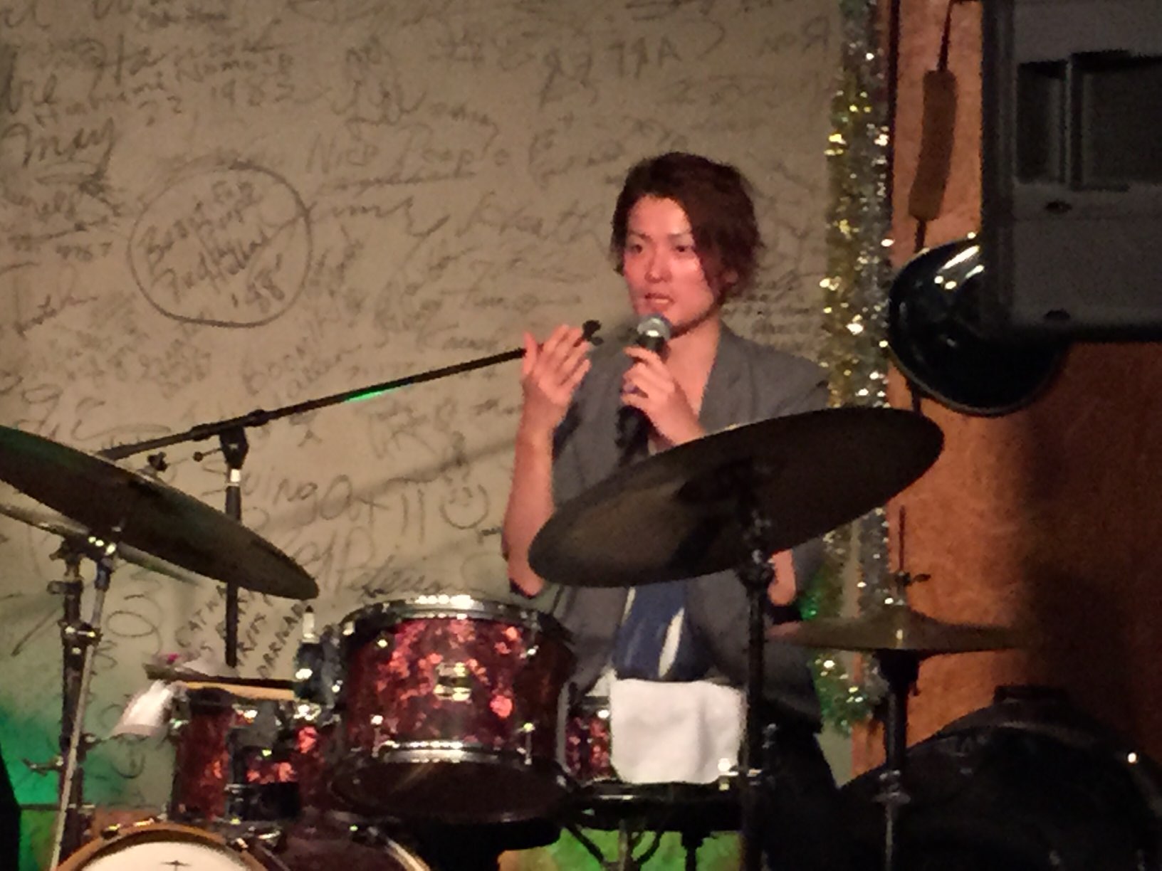 ステージの壁に書かれた来店ジャズメン達の手書きサインです。